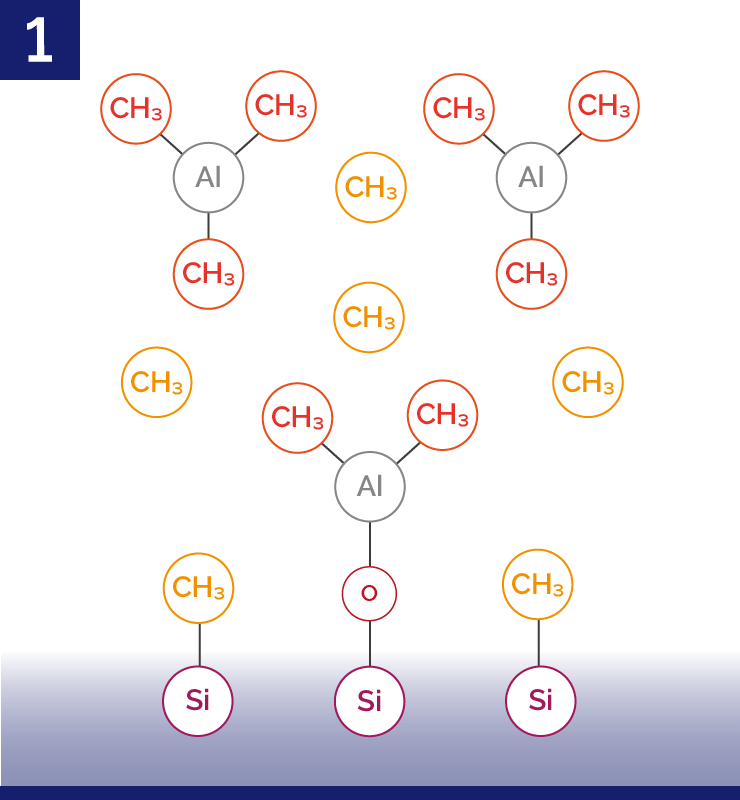步骤 1)在基底上添加TMA前驱体蒸汽,TMA 会吸附在基底表面并与之发生反应。通过选择适当的前驱体物质和参数,该反应会自限制。