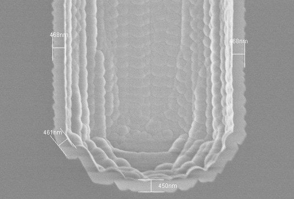 经过ALE加工,将25nm宽的Si沟槽刻蚀至110nm深,HSQ掩膜仍保留在原位。