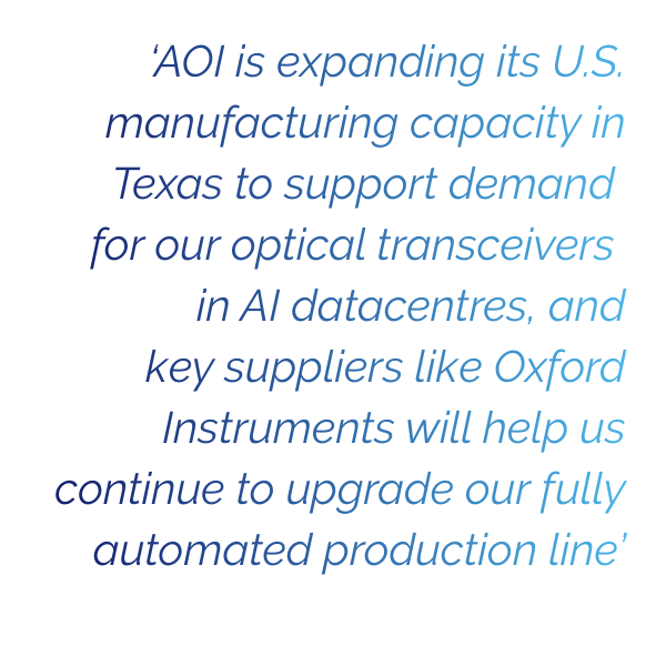 牛津仪器已与AOI达成合作,旨在加强美国境内先进磷化铟(InP)光电子器件的生产能力。随着AOI扩大其在得克萨斯州的业务以满足数据中心对光收发器日益增长的需求,牛津仪器将提供尖端的等离子体处理系统,以提升生产效率、产品质量及可扩展性。此次合作彰显了双方致力于推动新一代光电子制造创新的决心。